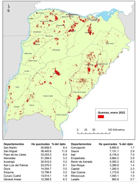 La evidencia satelital indica que aproximadamente el 3,8% de la superficie de la provincia de Corrientes sufrió quemas durante el mes de enero de 2022. Del total, el 58% de las coberturas afectadas por las quemas son áreas de humedales como esteros, bañados, malezales y vegetación de valles aluviales, el 35% pastizales y el resto 7,4% son bosques, tanto cultivados como nativos (Tabla 1).