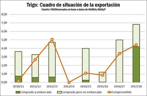 En este contexto, se observa un gran interés de los exportadores argentinos de acelerar el ritmo de negocios. El sector, según datos oficiales, ya ha pactado la compra de 6,8 millones de toneladas de trigo, una gran parte del saldo exportable estimado de la campaña frente a la perspectiva de una oferta ajustada. De dicho total, según el Ministerio de Agroindustria, ya se había embarcado para fines de diciembre nada menos que 4,2 millones de toneladas, un máximo histórico para esa altura del año comercial. En tanto, las ventas ya comprometidas (estén o no embarcadas) ascienden a 4,4 millones de toneladas, muy cerca de lo exportado, pero señalando que el sector exportador se está asegurando un stock de mercadería, a la fecha, de 2,4 millones de toneladas ya compradas pero aún no vendidas al exterior. Esta información está resumida en el último gráfico que acompaña el artículo.