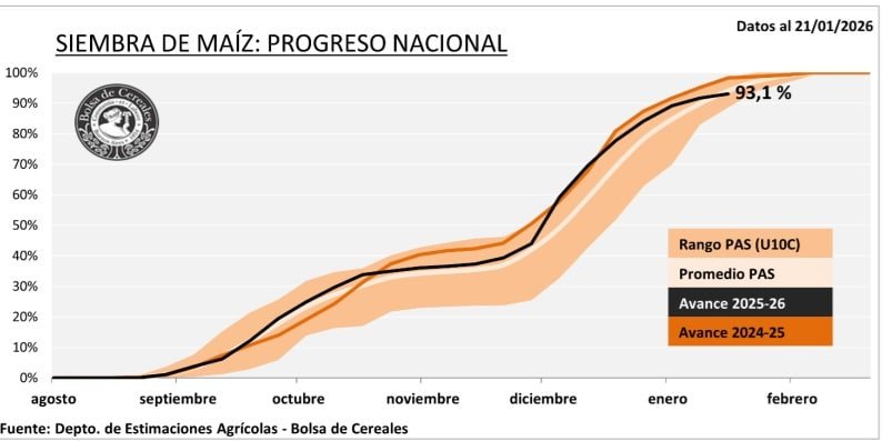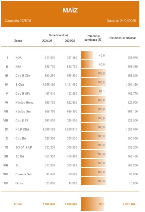 La campaña de maíz entra en una etapa decisiva, marcada por un avance sostenido de la siembra, pero también por desafíos que comienzan a reconfigurar el manejo en distintas regiones productivas. La implantación con destino a grano comercial alcanzó el 93,1 % del área proyectada, aunque todavía se mantiene 5,3 puntos porcentuales por detrás del ritmo registrado a esta altura de la campaña pasada.