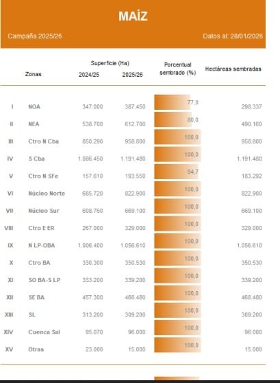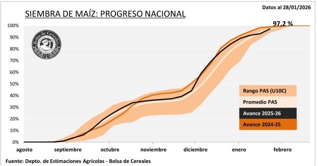 La campaña de maíz con destino a grano comercial se aproxima a completar su fase de implantación. A nivel nacional, la siembra alcanza el 97,2% del área proyectada, aunque el ritmo de avance continúa condicionado por la falta de piso en sectores del norte del país, lo que limitó el progreso semanal.