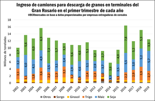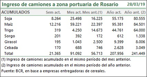 A pesar del fuerte ingreso de camiones en la última semana, al último día hábil de marzo de 2019 puede afirmarse que el ingreso de camiones a las plantas del Gran Rosario en el primer trimestre del año ha caído un 18% respecto al mismo período del año anterior y un 17% en relación al promedio de los últimos tres años, a medida que se agotan los inventarios de granos en lo que serán los últimos meses de la campaña 2017/18, diezmada por la sequía.