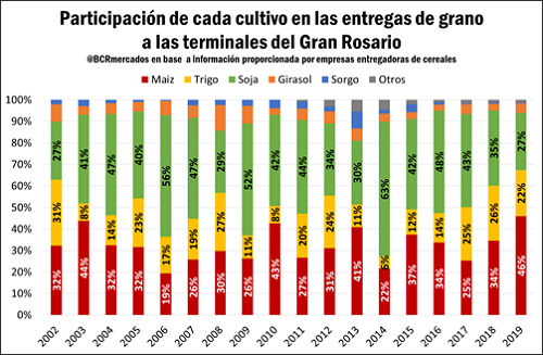 El maíz por su parte, si bien también resultó afectado el año pasado por las falta de humedad, la nueva cosecha ya empezó a levantarse, desde mediados del mes de febrero, aunque se generalizó en marzo. Esto es lo que se observa hoy en el movimiento de camiones en las terminales de la zona. Se destaca además que este año el maíz temprano o de primera tuvo una participación más alta en los planteos productivos, lo que redunda en mayor disponibilidad de grano en el primer semestre de este 2019. Gracias a ello, la entrega de mercadería a puerto por camión ya había subido un 28% en febrero y creció otro 15% en marzo de 2019, en relación a los mismos meses del año anterior. Se calcula que de este modo ya se habrían descargado unas 4,5 millones de toneladas de maíz en los puertos de nuestra zona.