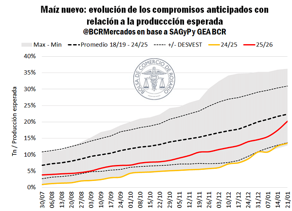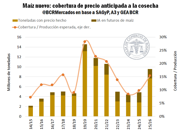 La verdadera sorpresa está en el maíz nuevo. La 2025/26 ya acumula compromisos por unas 12 Mt, el mayor volumen para esta altura en cuatro campañas y casi el doble que el año pasado.