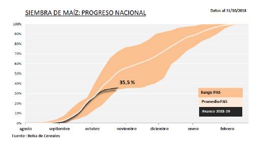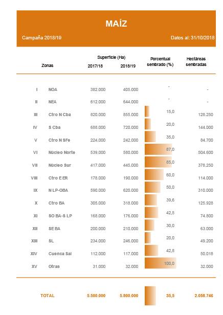Buenos Aires-Norte de La Pampa, Cuenca del Salado y el Centro de Buenos Aires. El avance a la fecha se ubica en el 35,5 %, marcando un progreso intersemanal de 1,1 puntos porcentuales. Frente a este panorama mantenemos la proyección de siembra de maíz con destino grano comercial para la campaña 2018/19 en 5.800.000 Ha. Por otro lado, se comenzaron a relevar los primeros lotes transitando el estadio de panojamiento en los departamentos del norte de la provincia de Santa Fe.