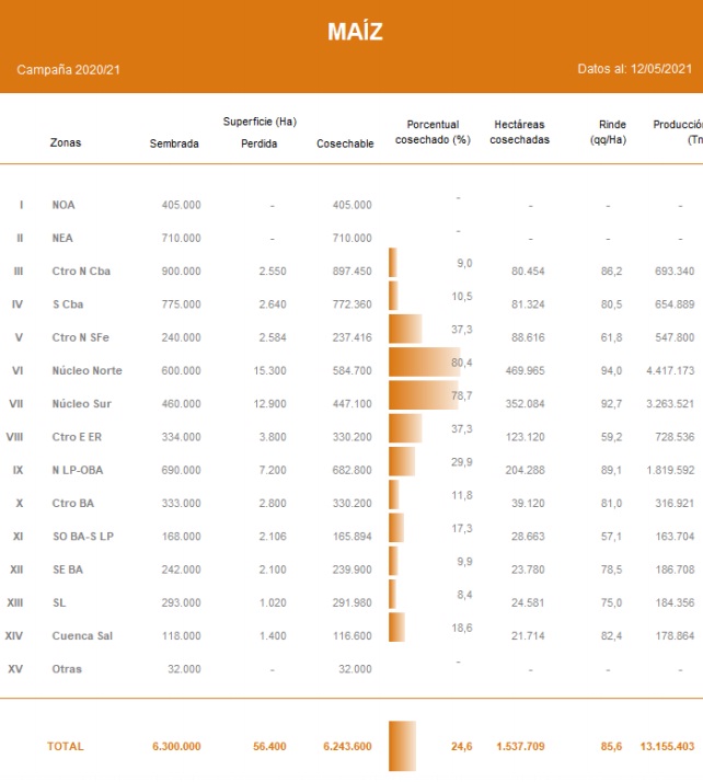 El avance de recolección nacional es del 24,6 % del área apta. La estimación de producción es de 46 MTn, 5,5 MTn menos que la campaña previa (Producción ciclo 2019/20: 51,5 MTn).