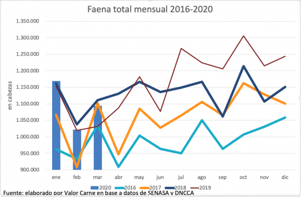 En el tercer mes del año, se faenaron 1,1 millones de cabezas, 7% más que en febrero y 6% más que hace un año.