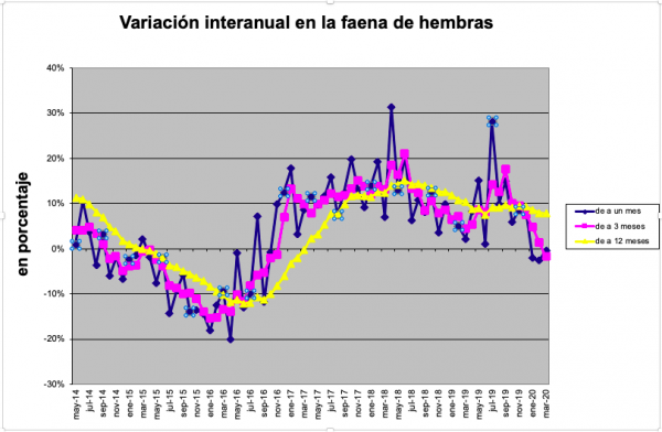 Esta diversidad en la oferta de machos y hembras ha hecho que la total venga creciendo, pero muy moderadamente. Desde julio de 2019, cuando la faena de 12 meses mostró igualdad con la de un año antes, ha venido aumentando, a razón de medio punto por mes, para llegar al +4% actual.