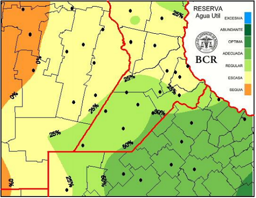 Según los cálculos de GEA, en el este de Córdoba el agua útil en la capa arable superficial se vuelve cada vez más escasa, y aunque el estado del trigo en pie todavía no ha presentado un desmejoramiento, la condición podría deteriorarse si el perfil no se recarga con agua teniendo en cuenta que comienza la etapa de encañazón. En esta fase, que comenzaría a desarrollarse en las próximas semanas, es cuando el trigo demanda mucho más agua, pero también es cuando se ingresa a septiembre, un mes en el cual vuelven las lluvias estacionales. En el resto de las regiones productoras las reservas de agua en el suelo para el trigo se reportan más que suficientes, especialmente en el sudeste bonaerense. En provincia de Córdoba se sembró el 21 % y se produjo casi 23 % del trigo a nivel nacional en el ciclo 2017/18, y allí se están dando algunas dificultades en cuanto a reserva de agua. Salvo algunos casos puntuales de lloviznas y lluvias, que podrían dejar entre 5 y 10 mm en el sudeste cordobés, no se esperan lluvias generalizadas en los primeros días de septiembre. Según Agroindustria se necesitan entre 40 y 50 mm de lluvias para que exista una cosecha importante en este sector.