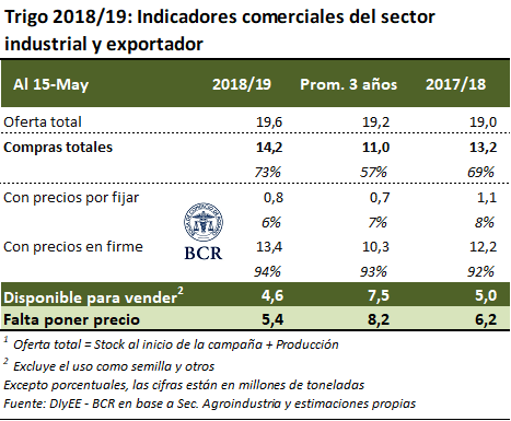 Según la información de la Secretaría de Agroindustria actualizada al 15 de mayo, los exportadores y la industria llevan comprado en conjunto 1,1 Mt del trigo a cosechar, una cantidad muy parecida a las compras de trigo nuevo que se habían registrado el año pasado a esta misma altura. En años anteriores, es decir, del 2017 hacia atrás, no era frecuente la compra del cereal a cosechar con tanta anticipación, de hecho habría que remontarse al año 2011 para encontrar un registro precedente, cuando al 18 de mayo de dicho año se habían adquirido 104 mil toneladas de lo que sería la cosecha 2011/12.