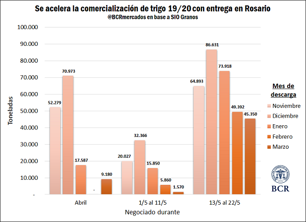 A partir de los datos referentes a las operaciones informadas en la plataforma SIO Granos, se observa la importante aceleración registrada en las últimas semanas de los volúmenes comercializados por trigo de la próxima campaña. Mientras en el mes de abril se habían efectuado negocios para la entrega en Rosario Norte y Sur entre los meses de noviembre de este año y marzo del 2020 por alrededor de 150 mil toneladas, en lo que va del mes de mayo (hasta el día 22) ese volumen se incrementó a poco menos de 400 mil toneladas.