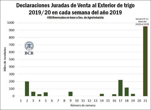 Esta mayor actividad en el mercado local de trigo nuevo tiene su correlato en el mercado de exportación. En lo que va de esta semana se contabilizaron declaraciones juradas de venta al exterior (DJVE) por 750 mil toneladas, siendo la semana de mayor actividad en este frente en lo que va del año. De este modo, las DJVE de trigo para la campaña 2019/20 totalizan 1.565.000 toneladas, una cifra muy relevante considerando que en los últimos ocho años a esta misma fecha todavía no habían comenzado a registrarse ventas al exterior.