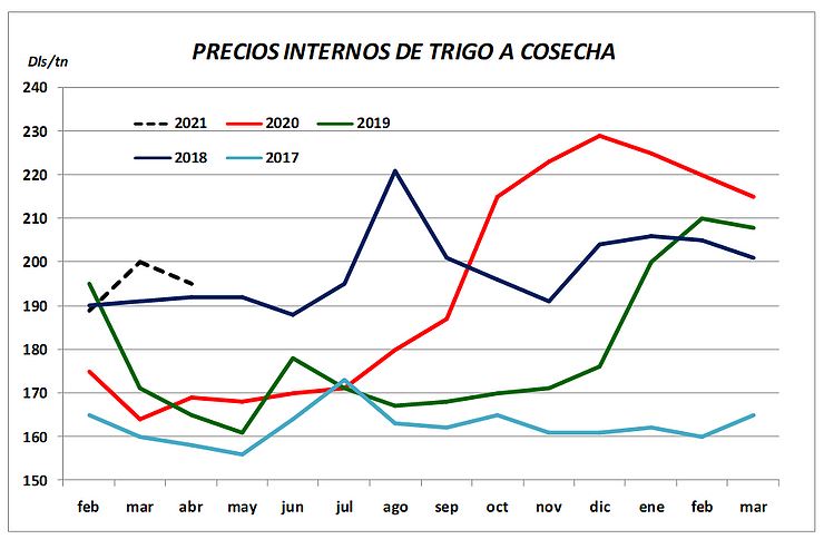 Las primeras proyecciones para el ciclo 2021/22 indican que producto de los buenos precios de trigo a cosecha, en torno a los 200 dol/tn (de los más altos del último quinquenio), y a pesar de un incremento importante en el costo de los insumos (Fertilizantes, fitosanitarios, etc.), es factible que el productor reitere la siembra e incluso la incremente respecto del ciclo anterior.