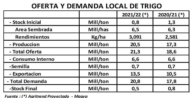Por lo expuesto, los precios internacionales, deberían continuar a lo largo del 2021/22 en niveles estables, no solo por la dinámica de la demanda, sino por el sostén adicional que le ofrece un ajustado esquema de oferta y demanda mundial de granos forrajeros, particularmente maíz y soja, que por efectos sustitutivos, compite directamente con el trigo para alimento animal.