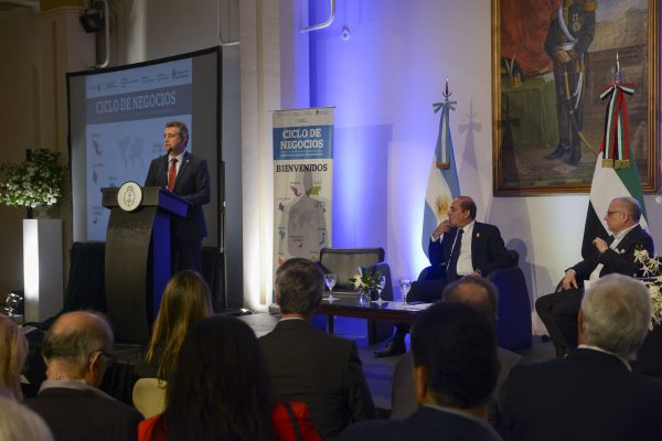 El ministro Luis Miguel Etchevehere celebró “la oportunidad de fortalecer las oportunidades de nuevos mercados con los Emiratos Árabes”, durante la apertura de la primera Edición del Ciclo de Negocios a Emiratos Árabes, que se llevó a cabo esta mañana en el Salón Libertador de la Cancillería Argentina.