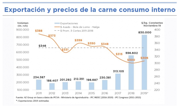 La consultora AZ Group analizó el desempeño de las exportaciones de carne vacuna de la Argentina durante los últimos nueve años y los comparó con el comportamiento de los precios al mostrador de los tres cortes que el INDEC toma para la confección del IPC.
