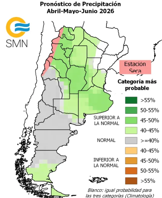 El Servicio Meteorológico Nacional anticipa que hasta junio las lluvias podrían ubicarse por encima de los valores normales en varias zonas productivas.