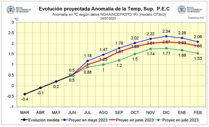 Variables. Este cambio implica que el evento Niño va se registrará durante la campaña gruesa 2023/24. Las anomalías de temperatura que son variables más estables como predictor de los modelos meteorológicos siguen mostrando un calentamiento muy importante. Lo que cambia es la importancia que tendrá este fenómeno frente a las demás variables que determinan las lluvias de la región pampeana.