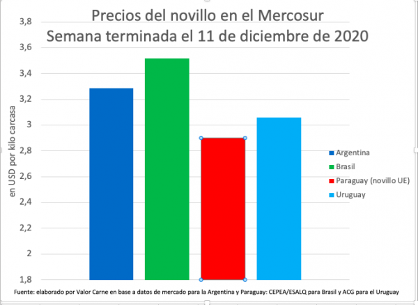 Paraguay: en un mercado escaso de oferta, la cotización del novillo terminado aumentó cinco centavos, para USD2,90. Con la relativa estabilidad de la plaza, el repunte del precio en la Argentina y el rebote en Uruguay, se consolidó como el mercado de menor precio de la región.