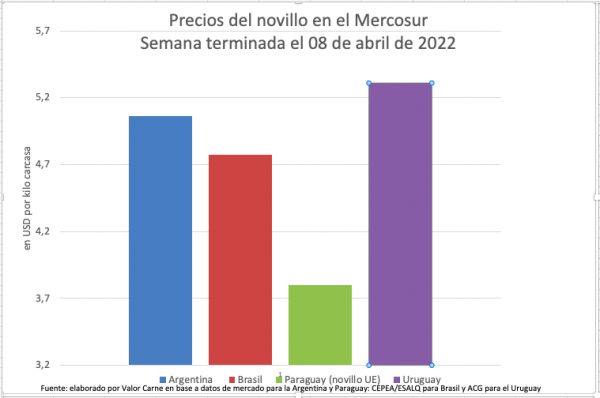 Uruguay: el novillo de exportación se paga USD5,31, ocho centavos más que la semana pasada. El buen nivel de actividad les da firmeza a todas las categorías, en la opinión de los consignatarios. El precio viene aumentando sin cesar desde principios de diciembre. La faena de la semana pasada fue de 54 mil cabezas, 3% menos que en la anterior e igual al promedio de las diez previas. Las exportaciones de marzo completaron 49 mil tec, mejorando la proyección que había hasta la tercera semana y superando en 8% a marzo anterior. Los embarques de los tres primeros meses son más altos que sus equivalentes de 2020 y de 2021.