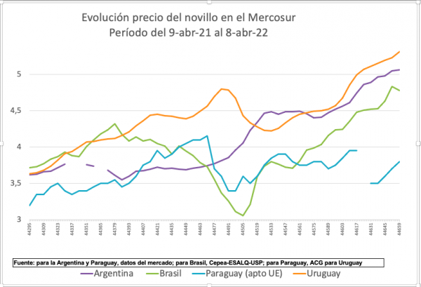 Paraguay: el novillo apto para la UE tiene un precio de USD3,80, aunque sigue habiendo una gran dispersión de cotizaciones, que se observa desde que Rusia, segunda plaza en importancia, invadió Ucrania y fue penalizada de diversas formas, incluidas las financieras.