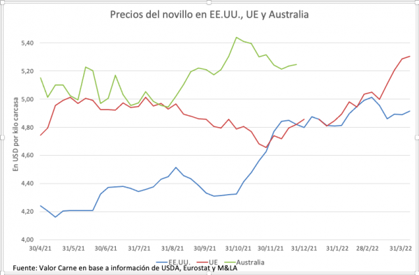 Se indican los valores del novillo terminado en plazas seleccionadas, expresados en USD por kilo carcasa.