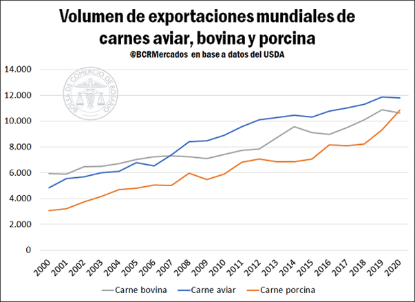 El sector porcino ha tenido un enorme desempeño a nivel internacional desde la óptica de la producción, el consumo y el comercio, lo que llevó a que el mismo adquiera una gran relevancia. El comercio internacional de carnes de origen porcino evidencia un incremento de importancia ya que el mismo ha crecido más que sus respectivos sustitutos, como lo son la carne de aves y bovinos. Desde el año 2000 hasta la actualidad el comercio de carne porcina muestra que el volumen de toneladas exportadas aumentó en un 252,11%, muy lejos de los registros de sus pares donde la carne de origen bovino creció un 79,32% y la de origen aviar 143,47%.