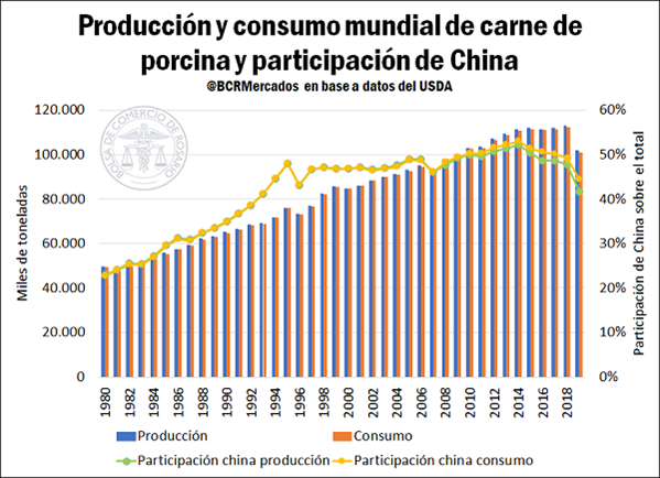 La producción de carne de origen porcino a nivel internacional se ha más que duplicado en los últimos 40 años y el consumo ha crecido en casi idéntica cuantía. Esto se debe en buena parte a la integración de China en el mercado internacional, en combinación con las mejoras en el ingreso de sus habitantes y consecuente aumento en el consumo interno de carnes. El gigante asiático representa hoy por hoy el principal productor, importador y consumidor de carne porcina a nivel internacional.