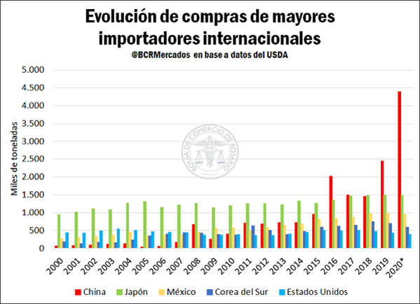 A pesar de presentar movimientos muy similares durante más de la mitad del período, en los últimos años la producción de carne porcina en China y su consumo han comenzado a separarse. Este fenómeno ha generado que, tal como se mencionó previamente, en la actualidad, el gigante asiático sea el principal importador a nivel internacional, superando a Japón que era hasta hace pocos años el máximo comprador de estos bienes.