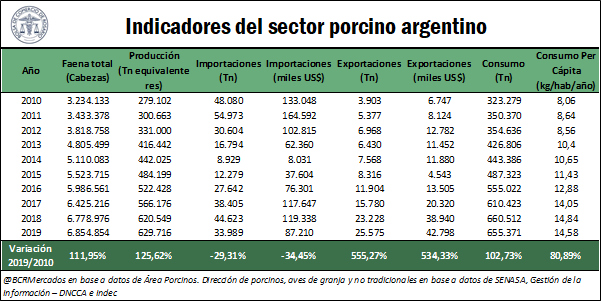Tal como se muestra, la faena y la producción más que se duplicaron en los últimos 10 años alcanzando a faenarse 6,8 millones de cabezas y produciéndose 629.716 toneladas de carne. Además, las exportaciones argentinas aumentaron en más de un 500% tanto en toneladas como en dólares. El auge del sector porcino en Argentina encuentra soporte en gran parte a los cambios en la dieta doméstica habiendo una sustitución de las carnes bovinas por carnes de origen porcino y carne aviar, además de la fuerte demanda del sector externo. Además del crecimiento en factores cuantitativos, la calidad de la carne porcina argentina ha mejorado constantemente. El índice de carne magra (contenido de tejido magro expresado como proporción del peso de la res) en 2011 presentaba un registro del 47,59% y en 2019 alcanzó el 56,60%. Es decir, el contenido de músculo sobre el peso de una res aumentó en 9 puntos porcentuales aproximadamente.