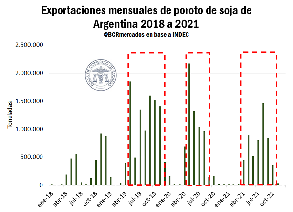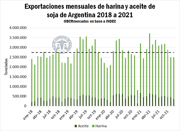 Una importante ventaja de la industria procesadora de soja de perfil exportador es la de contar con un flujo más estable a lo largo del año en los envíos al exterior de harina y aceite que lo que ocurre con el poroto de la oleaginosa.