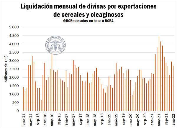 Si bien se observa cierta estacionalidad en la liquidación de divisas en el mercado cambiario, se puede apreciar que ésta no baja estrepitosamente en los meses fuera de cosecha. Esto se debe en parte a lo mencionado en los puntos 3 y 4. El hecho de que las compras de grano por parte de los industriales, así como también las exportaciones de derivados, sean más estables en el tiempo genera que las divisas liquidadas en el MULC sean más estables en el tiempo.