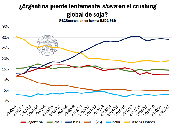 Existe una tendencia, que se ha ido afirmando en los últimos años, a incrementar los volúmenes de procesamiento del haba de soja en los países de destino, en la medida que económicamente cierre la ecuación. Esto perjudica a nuestro país. Si bien Argentina se fue afianzando en el mundo como principal abastecedor de productos derivados del procesamiento de soja, en los últimos años se empezaron a advertir ligeros retrocesos en la participación de Argentina en la molienda mundial de la oleaginosa, lo cual se nota en el gráfico adjunto.
