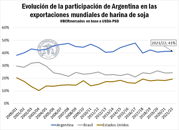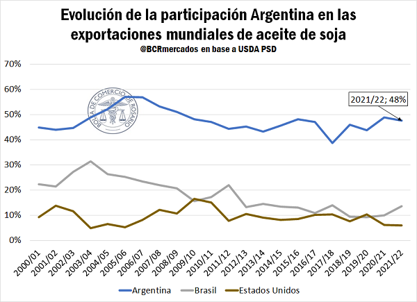 En cuanto al aceite, los números son incluso más impactantes. Argentina representó el 49% del total comercializado durante el último ciclo y se espera que alcance una participación similar en el que está pronto a comenzar (48%). Además, es tan marcada la relevancia que tiene el país en este mercado que ni sumando las participaciones de Estados Unidos y Brasil (18 y 24%, respectivamente), alcanzan el share de mercado de nuestro país.