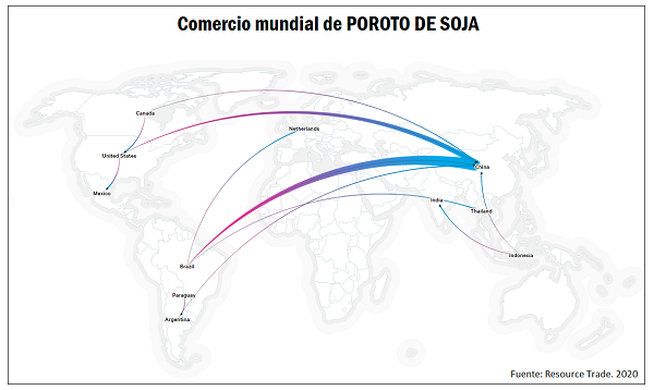 Esta elevada concentración que se da en los clientes de grano de soja argentino, también se registra, aunque en menor medida, a escala global. China se lleva más del 40% del comercio global de soja, seguida por la Países Bajos con sólo el 3%.
