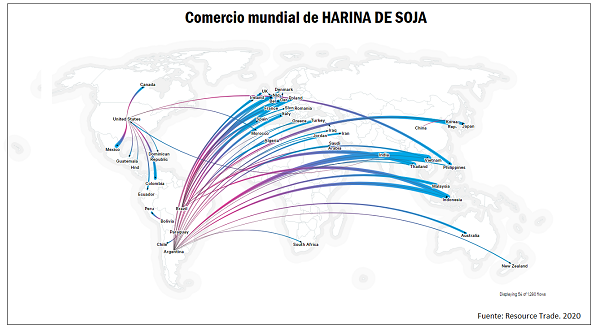 En el año 2021, Argentina exportó grano de soja a 19 países, pero China se llevó el 73% del tonelaje despachado. En igual período, 36 países fueron importadores del aceite de soja bruto de Argentina, siendo India el mayor cliente, llevándose el 63% del volumen exportado. Los clientes de pellets y/o harina de soja argentinos fueron 74 países, siendo Vietnam e Indonesia los que más importaron, con ambos países concentrando cerca del 11% de los envíos totales.