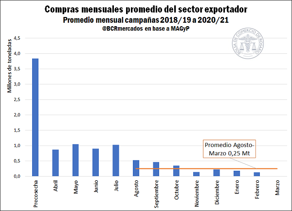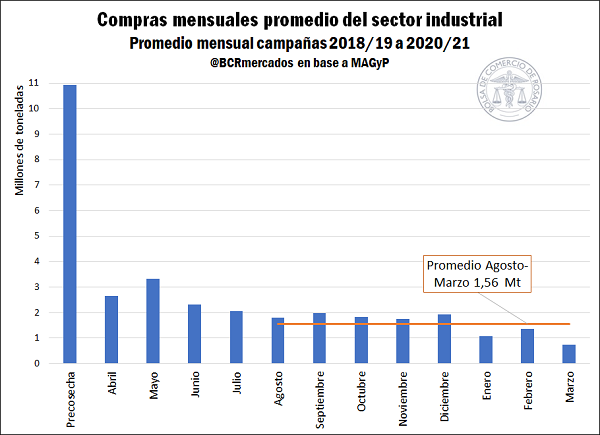 Vemos que, en el promedio de las últimas tres campañas, los volúmenes comprados por la industria en los meses de “contra cosecha” siguen siendo considerables. Según los datos del Ministerio de Agricultura, Ganadería y Pesca, entre los meses de agosto y marzo, la industria compro en promedio 1,56 millones de toneladas de soja en el mercado doméstico, mientras la exportación compró 0,25 Mt.