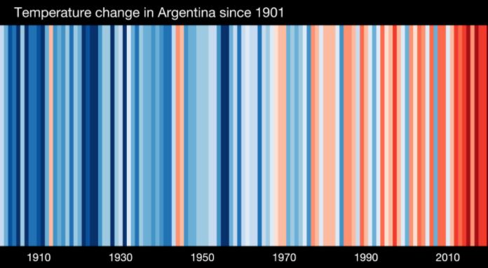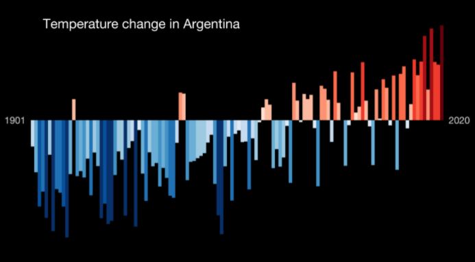 Para prácticamente todos los países o regiones, las franjas cambian de azules a rojas en los años más recientes, lo que ilustra el aumento de las temperaturas. El gráfico correspondiente a Argentina demuestra que nuestro país también se inscribe en la tendencia global.