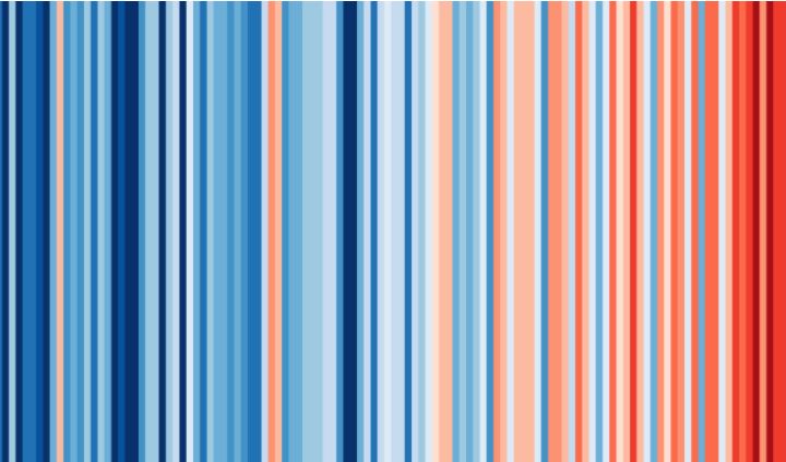 La campaña “Show Your Stripes” se basó en visibilizar los gráficos de “rayas cálidas” del profesor Ed Hawkins, científico climático de la Universidad de Reading en el Reino Unido, que son representaciones visuales del cambio de temperatura medido en cada país durante al menos los últimos 100 años. Cada franja es la temperatura promedio de un año, los colores azules representan valores más fríos que el promedio y los rojos temperaturas más cálidas.