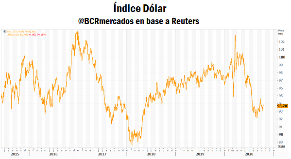 En este sentido, el índice dólar, que mide el valor del dólar estadounidense en relación a una canasta de monedas extranjeras, hoy se encuentra en sus valores más bajos en casi dos años y medio.