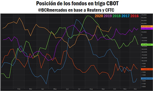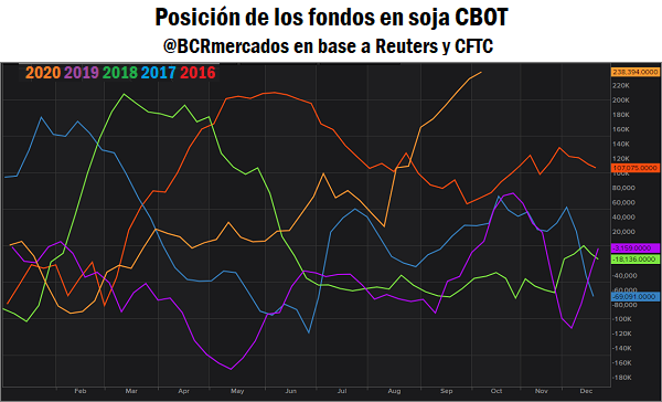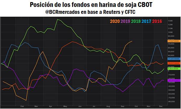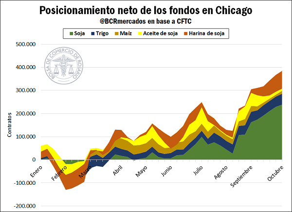 Los fondos que especulan con futuros y opciones de soja mantienen una posición compradora neta desde finales de abril, y han venido incrementando esta posición de forma ininterrumpida en las últimas ocho semanas. Al 6 de octubre, los fondos de inversión registraron la posición alcista más importante desde agosto de 2012, alcanzando 32,4 millones de toneladas (238.000 toneladas). En esa misma semana, los futuros de soja tocaron máximos en dos años y medio en Chicago.