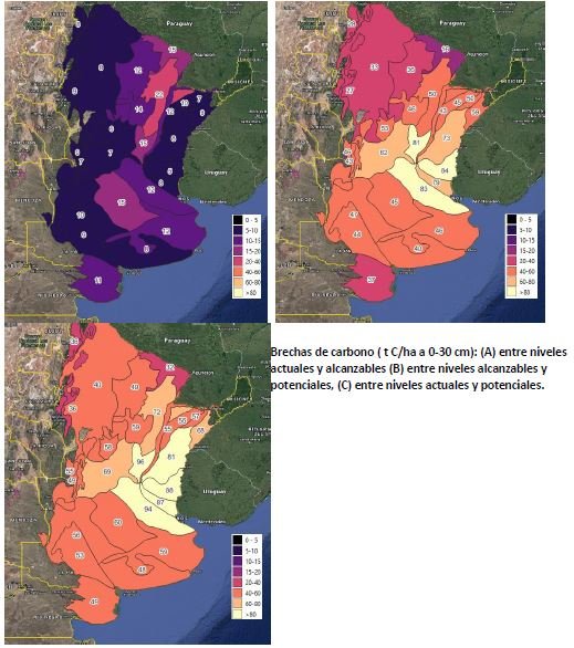 Estos primeros datos se obtuvieron a partir del acuerdo de trabajo en conjunto entre Aapresid y Syngenta. Los mismos consisten en mapas de las brechas entre los niveles actuales de carbono orgánico que secuestran los suelos agrícolas y los niveles alcanzables y potenciales para cada región.