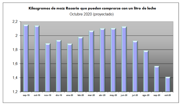 En valor maíz –considerando el promedio mensual Rosario disponible– el precio de la leche se ubicó el mes pasado en 1,55 kilogramos, una cifra 12% inferior a la de agosto de este año y 27% más baja que la de septiembre de 2019. Esa relación se deterioraría de manera creciente en el presente mes de octubre.