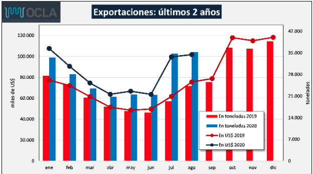 En litros de leche equivalentes, las exportaciones argentinas –según el último dato oficial disponible– representaron para los primeros ocho meses de 2020 el 23,4% de la producción total, lo que implicó unos 515 millones de litros de leche adicionales respecto a igual período del año pasado. De todas maneras, debido al crecimiento de la producción y el estancamiento del consumo interno, se generó en el período un stock de 129 millones de litros que aún no pudo encontrar destino de comercialización.