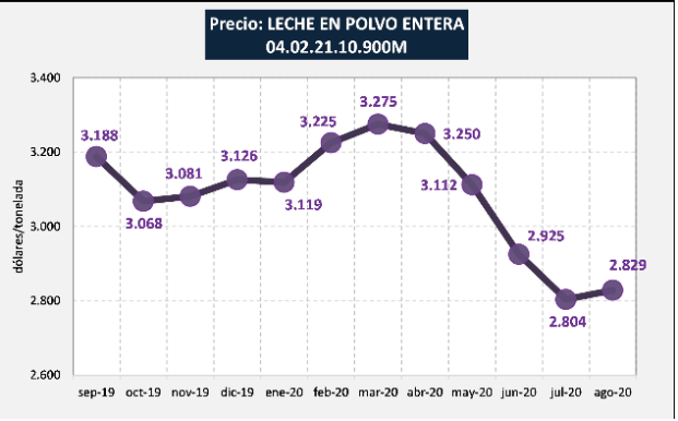 Si bien las exportaciones argentinas de lácteos crecieron en lo que va de 2020 respecto al año pasado, la mayor parte de las operaciones se están realizando sin rentabilidad debido a la caída de precios internacionales registrada a partir de junio pasado y la aplicación de derechos de exportación, que en el caso de la leche en polvo –principal producto de exportación– alcanza el 9,0% del valor FOB.