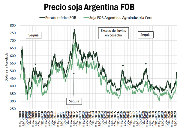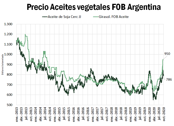 Desde los mínimos registrados en los meses de marzo y abril de este año, el precio de las oleaginosas no ha parado de subir. La soja en Chicago superó la barrera de los 10 USD por bushel (367 USD/tn) en el contrato más cercano, registrando un aumento de más del 20 % desde los mínimos de abril. La recuperación del precio de los commodities y de los mercados financieros ha tenido una marcada correlación a nivel mundial, encontrando piso sobre los meses mencionados. Diversos activos han podido recuperar sus valores e incluso superar los precios anteriores a la pandemia. Este fue el caso de las oleaginosas y sus aceites derivados. Si miramos los precios del aceite de girasol y soja FOB spot en Argentina, a la fecha cotizan 950 y 830 USD/t respectivamente. Desde mínimos de abril han marcado un incremento del 50 y 42 %, respectivamente. En particular, el precio del aceite de girasol ha alcanzado máximos de 6 años, de manera similar a lo que ocurre en los mercados europeos. El precio del aceite de soja, por su parte, alcanzó los niveles que existían antes de la pandemia y se sitúa en máximos de 3 años.