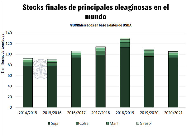 • Menores stocks de oleaginosas esperados en el mundo para finales de la campaña 20/21. Las mayores compras de China de oleaginosas permitirían en esta nueva campaña 20/21, disminuir los stocks a nivel global mejorando el panorama de precios tanto para la soja como para el girasol. Según datos del USDA, se espera que los stocks finales de soja terminen en 93,5 Mt, cayendo un 2,5 % respecto de la campaña anterior. Este nivel de stocks se encontraría en niveles similares a los registrados en la campaña 16/17.