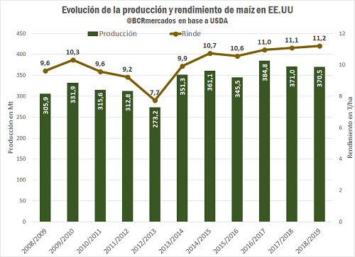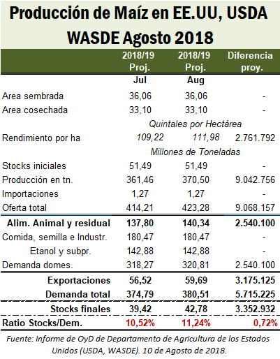 El viernes 10 de agosto, el USDA publicó su reporte mensual de Oferta y Demanda Mundial y estadounidense para diversos commodities. El informe terminó sorprendiendo a los analistas de mercado ya que proyectó un rinde de maíz mucho mayor al esperado, alcanzando a 112qq/ha como promedio nacional en EE.UU. Este valor, de concretarse, marcaría un record y llevaría la producción de maíz estadounidense a 370,5 Mt, el tercer volumen más alto en la historia de ese país, de acuerdo con el USDA.