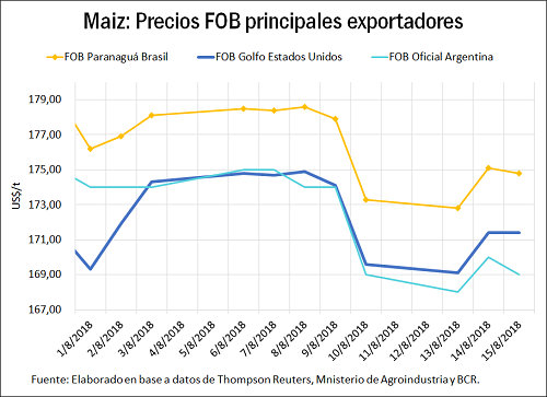 En el plano local, luego de haber descendido hasta el equivalente a US$150,2/t el lunes 13, el precio del maíz pudo recuperarse siguiendo la tónica externa. La recuperación en la semana se da frente a una sólida demanda externa, que propone pisos a la cotización del cereal. Hay un crecimiento económico mundial proyectado en 3,9 % para cada uno de los años 2018 y 2019, según estimaciones del Fondo Monetario Internacional (FMI) en el reporte de junio último. Las economías emergentes de Asia, cuyo crecimiento anual está previsto en alrededor de 6,5 % durante 2018-2019, siguen siendo el motor más importante de este fenómeno. Este es el destino en donde la demanda de maíz ha exhibido un crecimiento sostenido año a año y se espera que así continúe en el futuro.