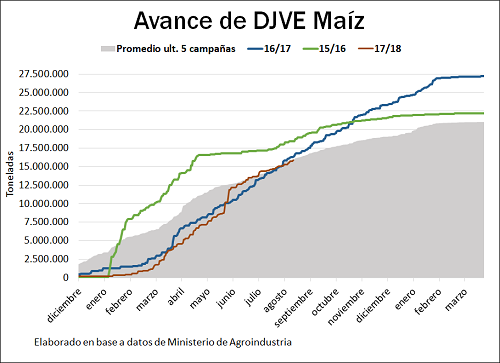 Las ventas de exportación de maíz de la campaña 2017/18 se encuentran en niveles muy similares a las del año pasado. A mediados de agosto, los compromisos externos 2017/18 ya alcanzan a 15,9 Mt, frente a 16,31 Mt en la campaña pasada a igual fecha. El patrón de ventas externas se plantea muy similar al de la campaña anterior, con un muy alto ritmo de negocios teniendo en cuenta que las proyecciones de exportación son menores debido a las pérdidas productivas de la presente campaña.
