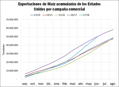 A pesar de que las exportaciones de maíz se ubican un 1,4% por debajo de la campaña pasada, el pronóstico del USDA de mayores exportaciones del cereal en el 2017/18  señala el potencial de un repunte de las ventas en los últimos dos meses -julio y agosto-. Los principales socios comerciales de EE.UU., incluyendo a México y Colombia, compraron mayores volúmenes de maíz en comparación con la última campaña, por lo que ambos mercados crecieron alrededor del 9 % anual. Este crecimiento en el volumen de los GAIF indica el buen momento que pasa la exportación agroindustrial de EE.UU., a pesar del conflicto con China. Este sector continúa beneficiándose notablemente a partir del acceso a los mercados que imponen los acuerdos de libre comercio.
